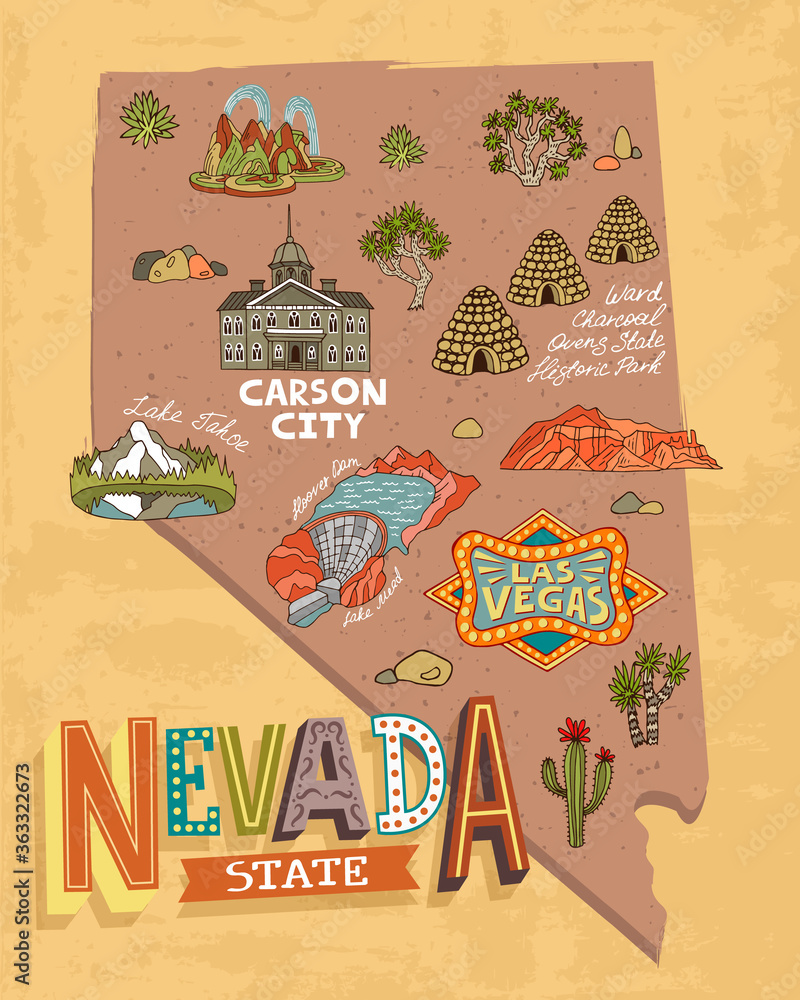 Illustrated map of Nevada, USA. Travel and attractions. Souvenir